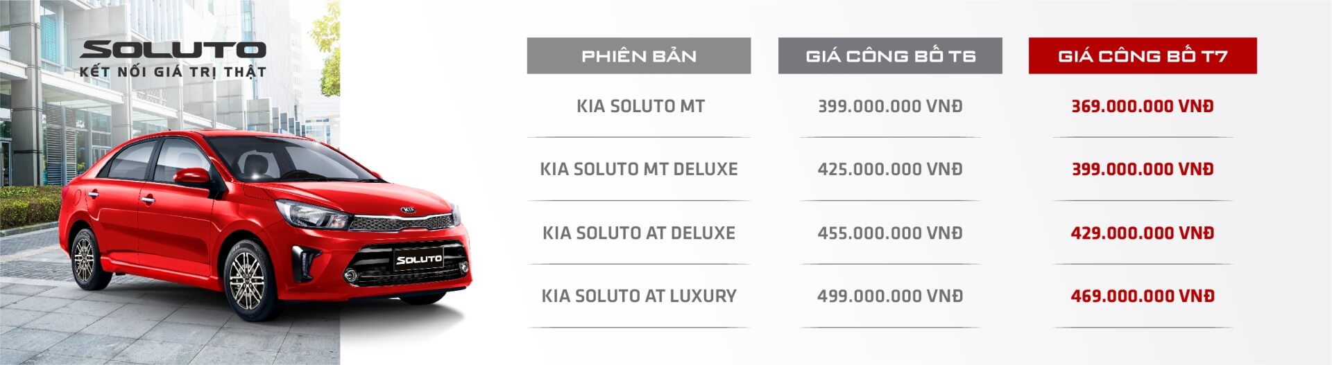 Từ ngày 06/7/2020, Kia công bố giá mới cho tất cả các dòng xe, trong đó mẫu xe Kia Soluto có giá chỉ từ 369 triệu đồng, mức giá mới tốt nhất phân khúc B-Sedan. Ngoài ra, mẫu xe Kia Cerato có giá chỉ từ 529 triệu, cạnh tranh cả một số mẫu xe phân khúc B.