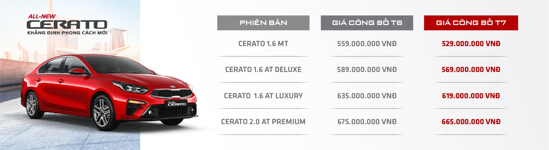Ngoài ra, mẫu xe có doanh số dẫn đầu phân khúc C, Kia Cerato cũng được áp dụng giá mới chỉ từ 529 triệu đồng. Với mức giá mới, C-sedan Kia Cerato có mức giá bán tốt nhất phân khúc C, thậm chí còn ngang bằng với một số mẫu xe trong phân khúc B. Đây là cơ hội hiếm có cho những khách hàng đang sử dụng xe phân khúc B muốn nâng cấp lên xe phân khúc C để sở hữu ngay một mẫu xe mới, sang trọng và tiện nghi hơn với mức giá tương đương. Các mẫu xe còn lại đều được áp dụng mức giá mới tốt nhất theo từng phân khúc.