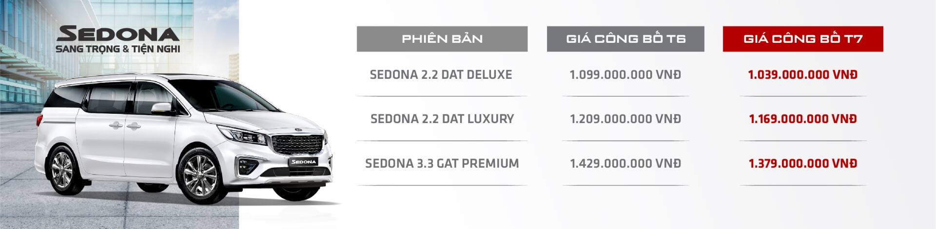 Mức giá mới công bố cho các dòng xe sẽ được Kia Việt Nam áp dụng từ ngày 06/7/2020. Đây cũng là mức giá tốt nhất kể từ đầu năm 2020 của thương hiệu. Cụ thể, mức giá giảm cao nhất lên đến 60 triệu đồng cho mẫu xe Kia Sedona – mẫu xe gia đình tốt nhất năm 2020 do tạp chí Parents, Mỹ bình chọn.